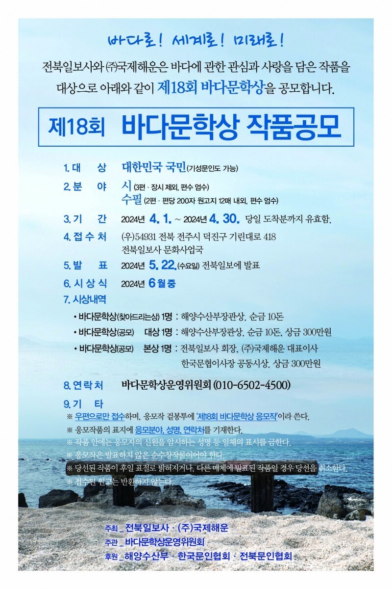 ※ 우편으로만 접수하며, 응모작 겉봉투에 ‘제18회 바다문학상 응모작’이라 쓴다.